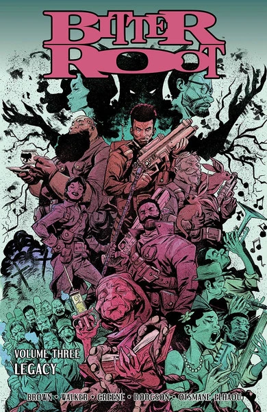 Bitter Root volume 3: Legacy contains issues #11-15, and features story by Chuck Brown and David F. Walker and art by Sanford Greene and Sofie Dodgson.